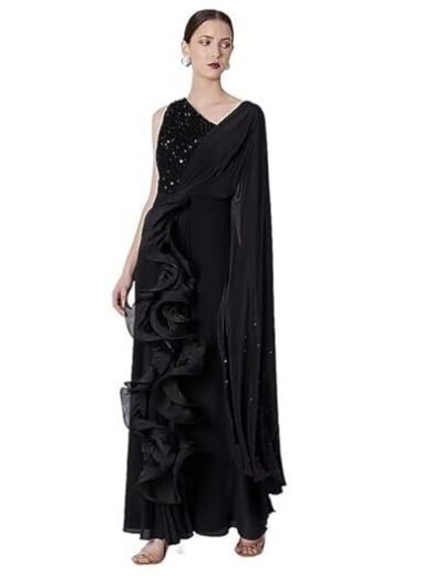 Gown Saree, Black Crepe and Net, Ruffled Draped Style, Wedding