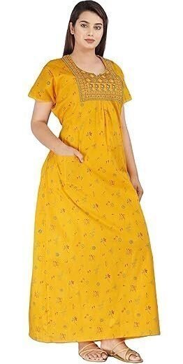 Cotton Nighty for Women | Yellow color Printed Night Gown for Women with Pocket | Maxi Nighty, Comfortable Sleepwear for Daily Use