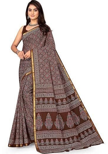Printed cotton saree with unstitched blouse piece | Ajrakh Printed Saree | Pure Cotton Mul Mul Printed Saree | Zari Border with Blouse Piece | 100% Cotton Saree (Brown)