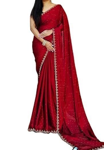 PURE SOFT SATIN CHIFFON FABRIC ON BEAUTIFUL ALL OVER SIROSKI WORK WITH CUT WORK BORDER IN SAREE