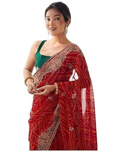 Georgette Bandhani Printed Sequence Embroidery Lace Saree With Unstitched Blouse Piece
