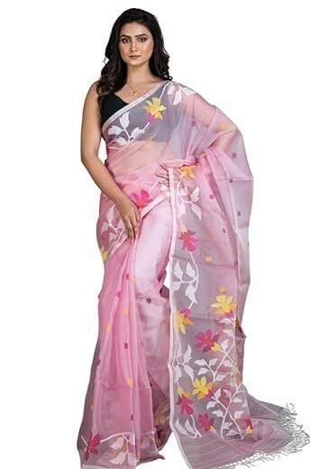 Silk Dhakai Jamdani Saree in Lemonade Pink & Off White in Multicolored Minakari Thread Work for Women Hand Woven Floral Nakashi Work Rich Texture Smooth Finish Indian Sari