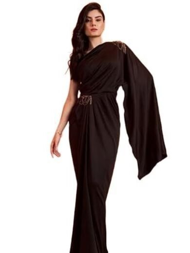 Shoulder Black Saree Gown Women - Party, Cocktail, Wedding Dress (Black)