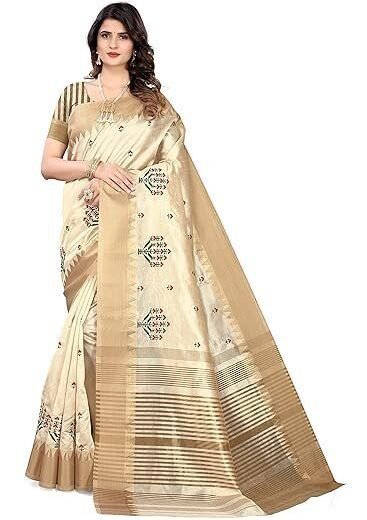 Women's Assam Cotton Silk With Golden Border Thread Embroidery Saree With Blouse Piece