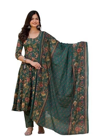 Women's Floral Embellished Anarkali Kurta with Churidar and Dupatta Set
