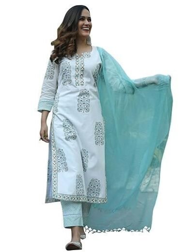 Pure Cotton Printed Straight Kurta with Pant & Dupatta Suit