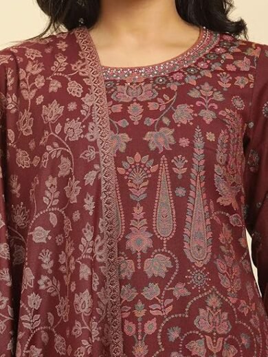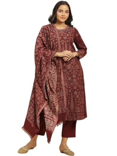 Woman Black Printed Acrylic Kurta, Pants and Shawl Set