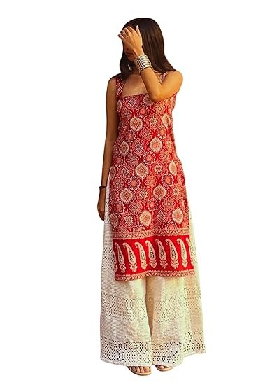 omen's Sleeveless Ajrak Print Kurti, Pure Cotton Straight Fit Straight Cambric Jaipuri Printed Kurti
