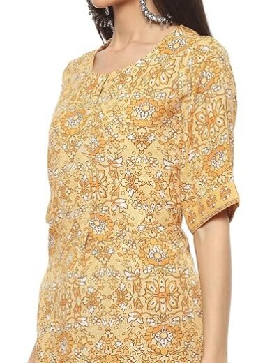 Women Mustard Yellow Cotton Kurti with White Floral Print V-Neck – Cotton Kurti for Women