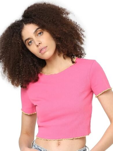 Women Cotton Blend Regular Fit Crop T-Shirt with Scallop Hemline
