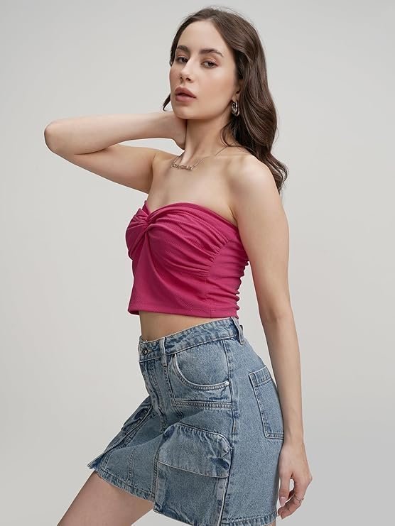 - ????? Product Description: This chic tube crop top features a twisted front detail, adding a stylish and flattering touch. The strapless design enhances its sleek appeal, making it a perfect statement piece for both casual and dressy occasions