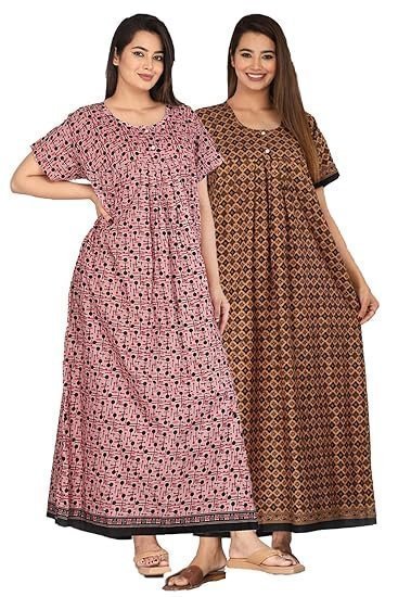 Cotton Nighty for Women | multi Printed Night Gown for Women with Pocket | Maxi Nighty, Comfortable Sleepwear for Daily Use ( pack of 2)