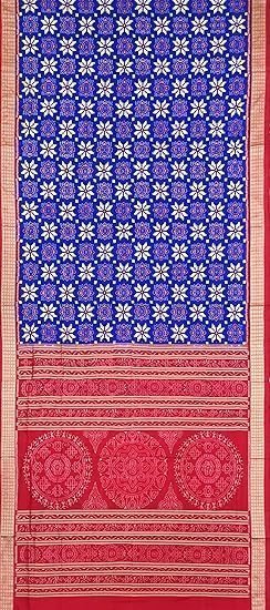 - DESIGN PATTERN: Beautiful Sambalpuri silk saree featuring an elegant blue base with intricate flower designs throughout the body