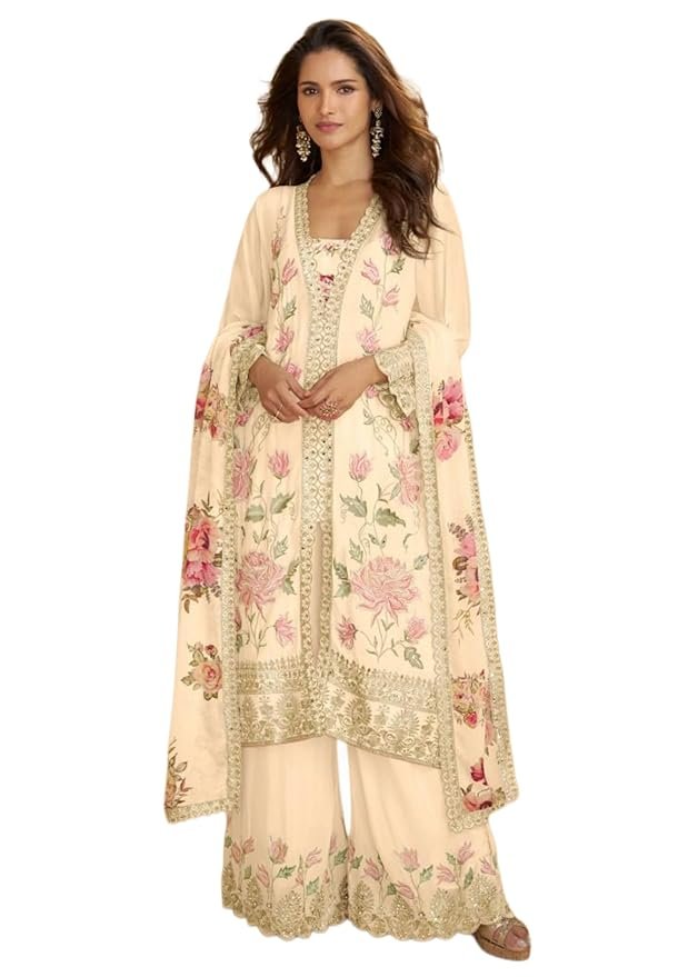 • SET INCLUDES: Three-piece set comprising a beautifully embroidered kurta, matching sharara pants with detailed border work, and a coordinating dupatta