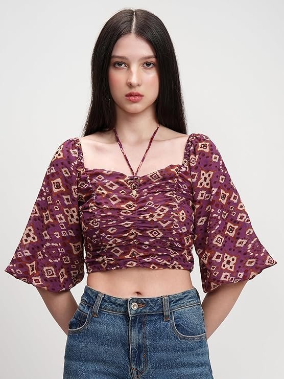 - ????? Product Description: Embrace a playful yet elegant style with this floral print fitted crop top featuring short puff sleeves. The flattering fitted silhouette offers a sleek look, while the puff sleeves add a touch of fun and femininity. Made from soft, breathable fabric, this top ensures comfort while elevating your wardrobe
